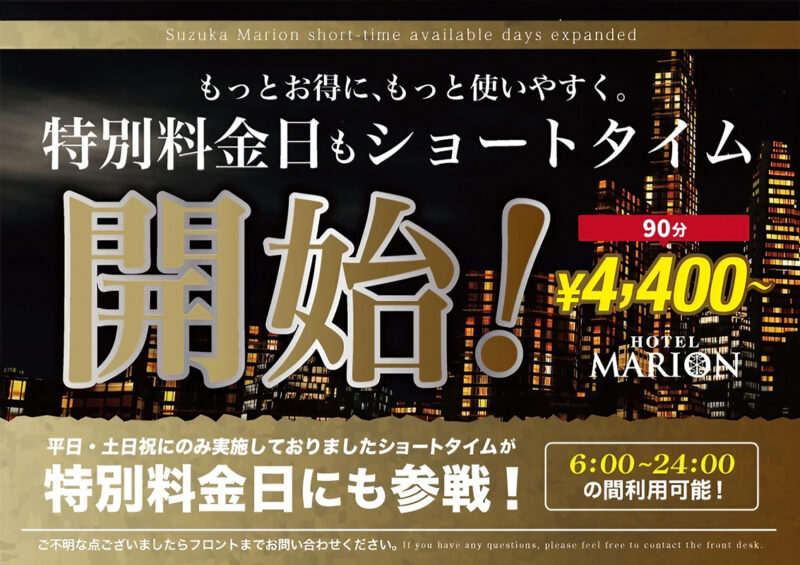 2024/12/13 キャンペーン 特別料金日もショートタイム利用が可能になりました! ショートタイム拡大! これまで平日・土日祝日のみ実施していたショートタイムプランを、特別料金日にも拡大いたしました。 90分4,400円〜で、朝6時から深夜24時までご利用いただけます。 より便利に、よりお得になったショートタイムプランで、ホテルマリオンの快適なサービスをご体験ください。