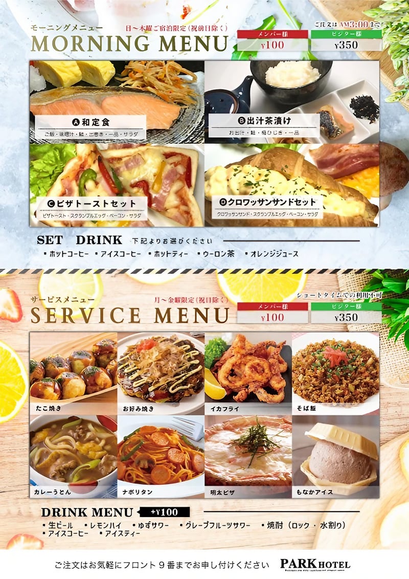 日曜日から木曜日限定で、お得なモーニングメニューとサービスメニューをご用意しております。