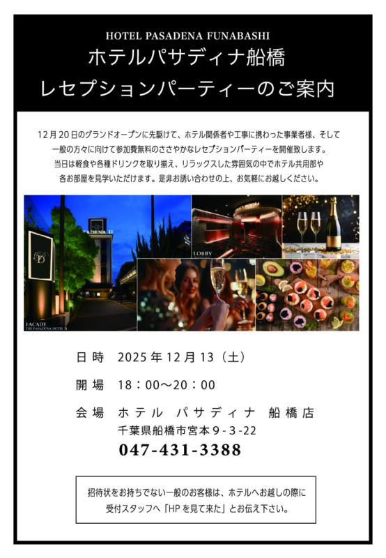 ホテル パサディナ 船橋のグランドオープンを記念して、 特別なレセプションパーティーを開催いたします!