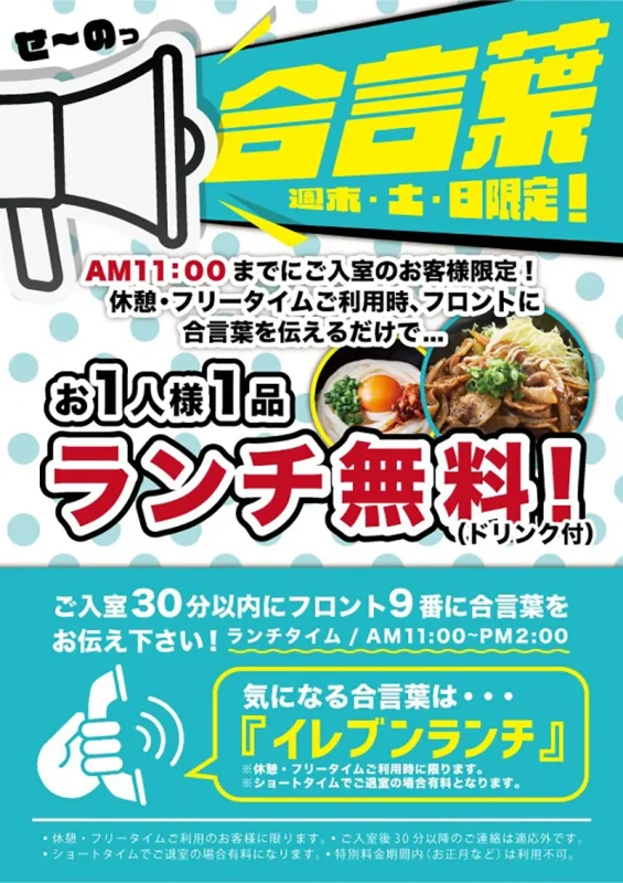休憩・フリータイムご利用時、フロントに合言葉を伝えるだけで…お1人様1品 ランチ無料!(ドリンク付)